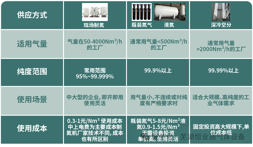 目前主流的方式主要分为现场制氮和购买氮气(现场制氮:PSA制氮机和深冷空分;购买氮气主要有液氮储罐和瓶装氮气。具体如下表: